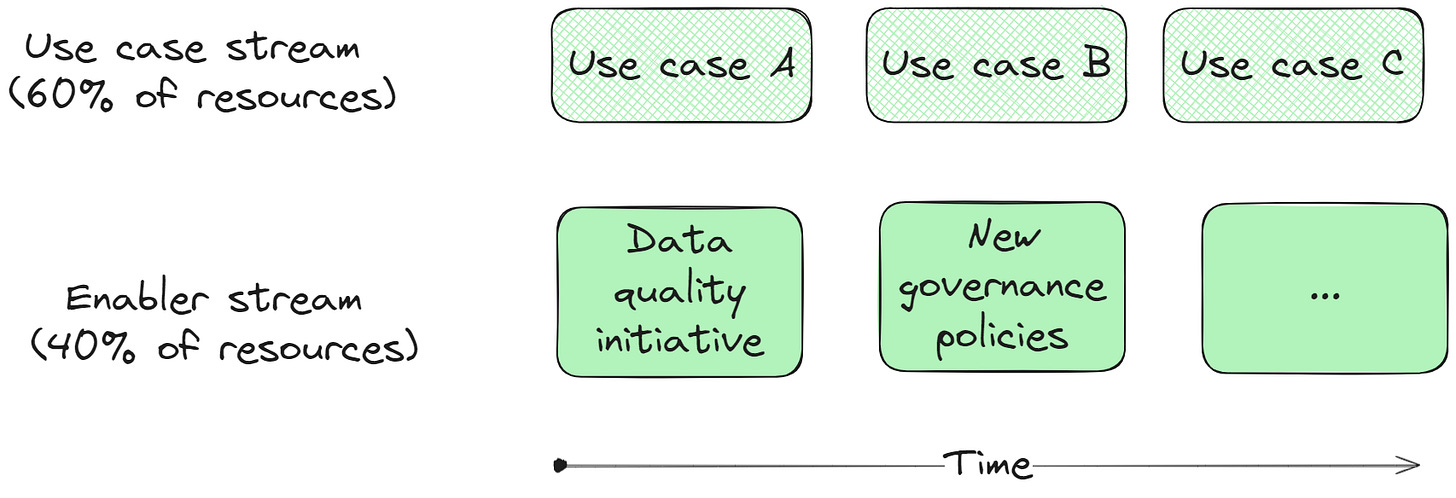 A two-stream approach is often viable, even advised - after all, how would we know which data platform functionalities to prioritize if we are not also working on the use cases that need the support? The ratio of resources depends on your case, if you are a larger organization you might get away with a larger chunk in the enabler stream.