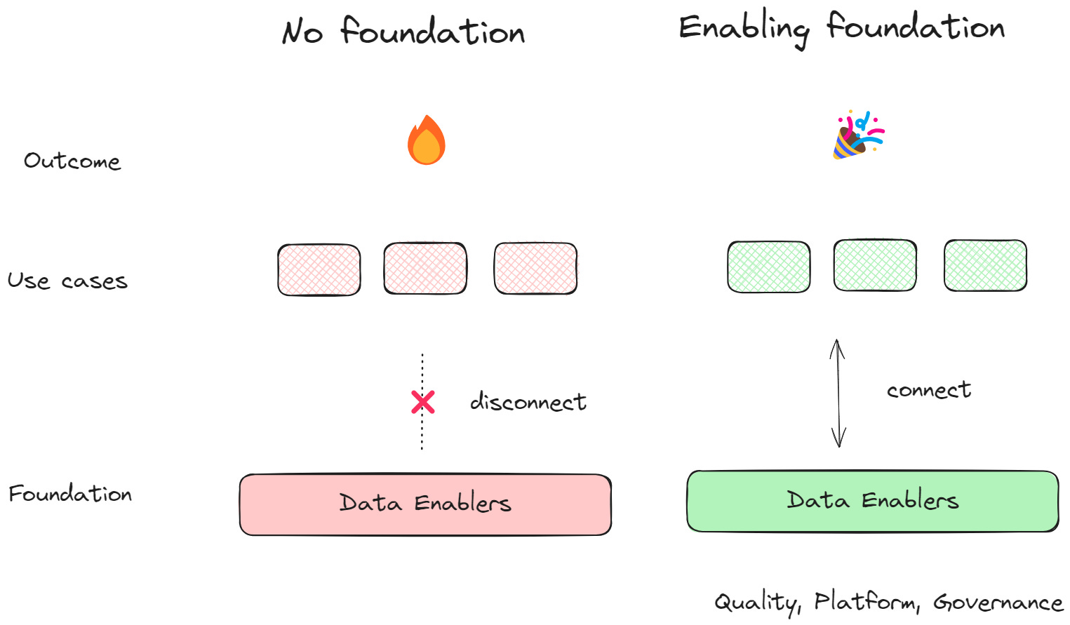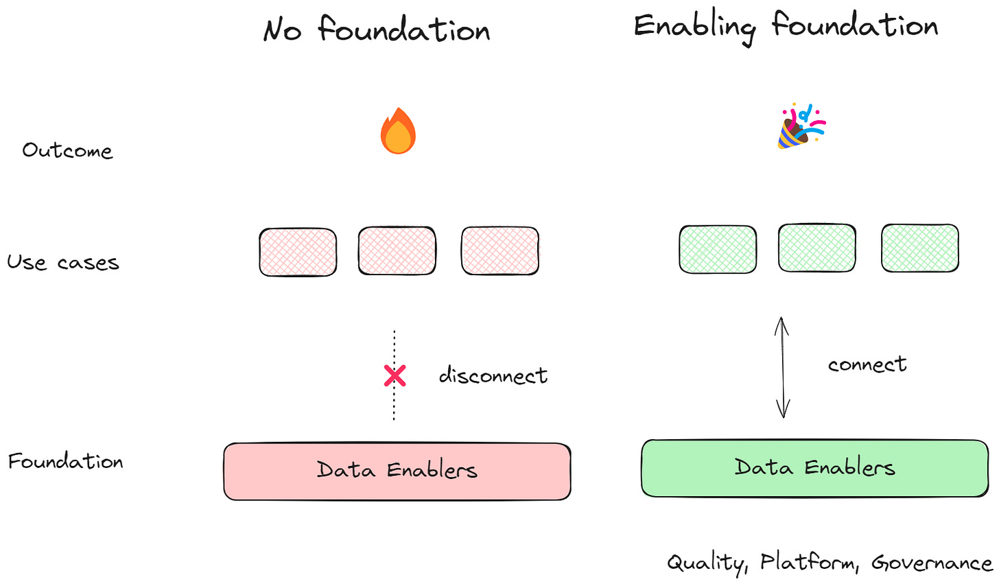 While I am a huge proponent of iterative, rapid prototyping approaches to data and AI-powered products (quickly proving value before you commit) - we should never ignore investments in enabling data projects. Otherwise, we can end up with no foundation2. Let’s visualize: